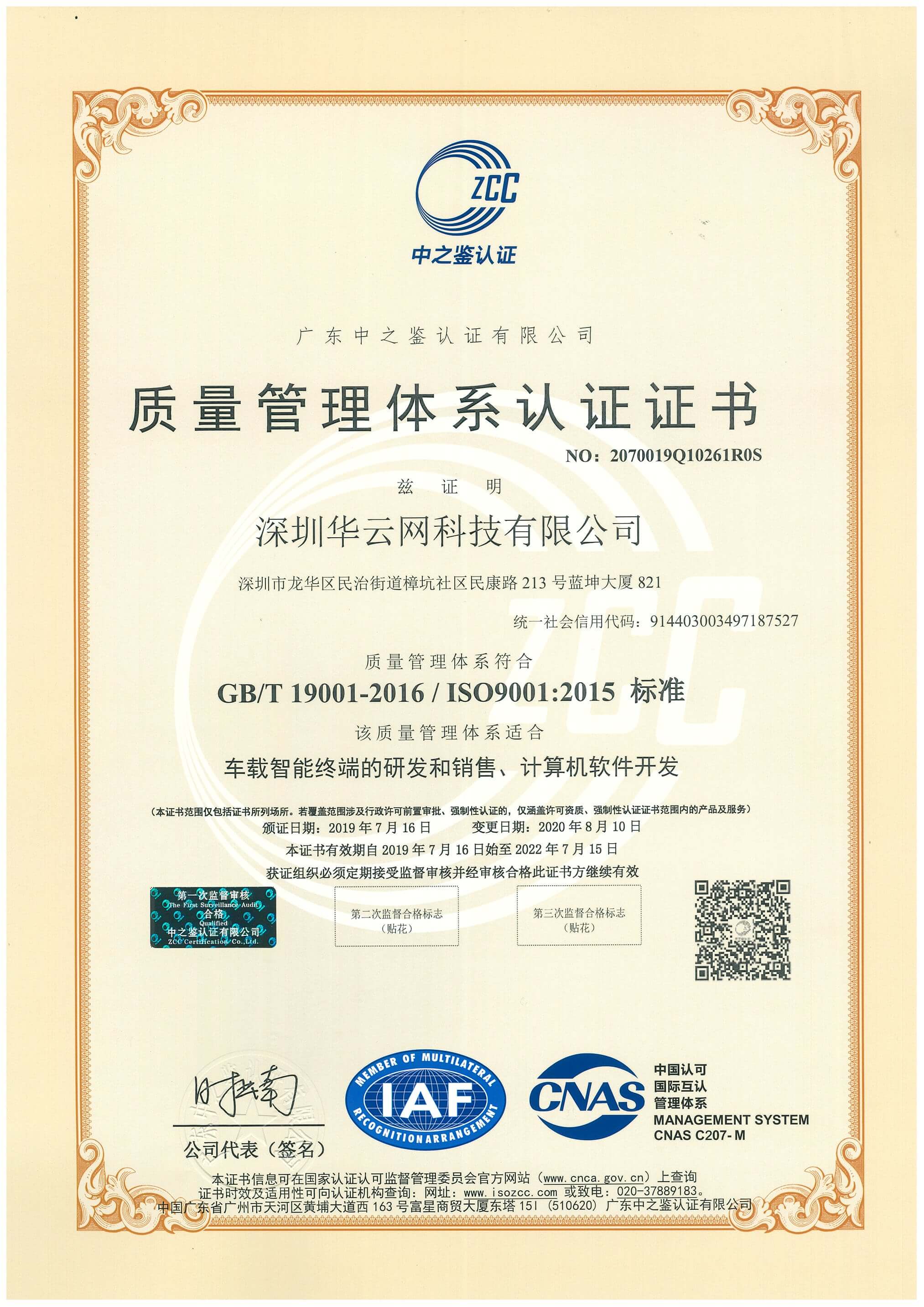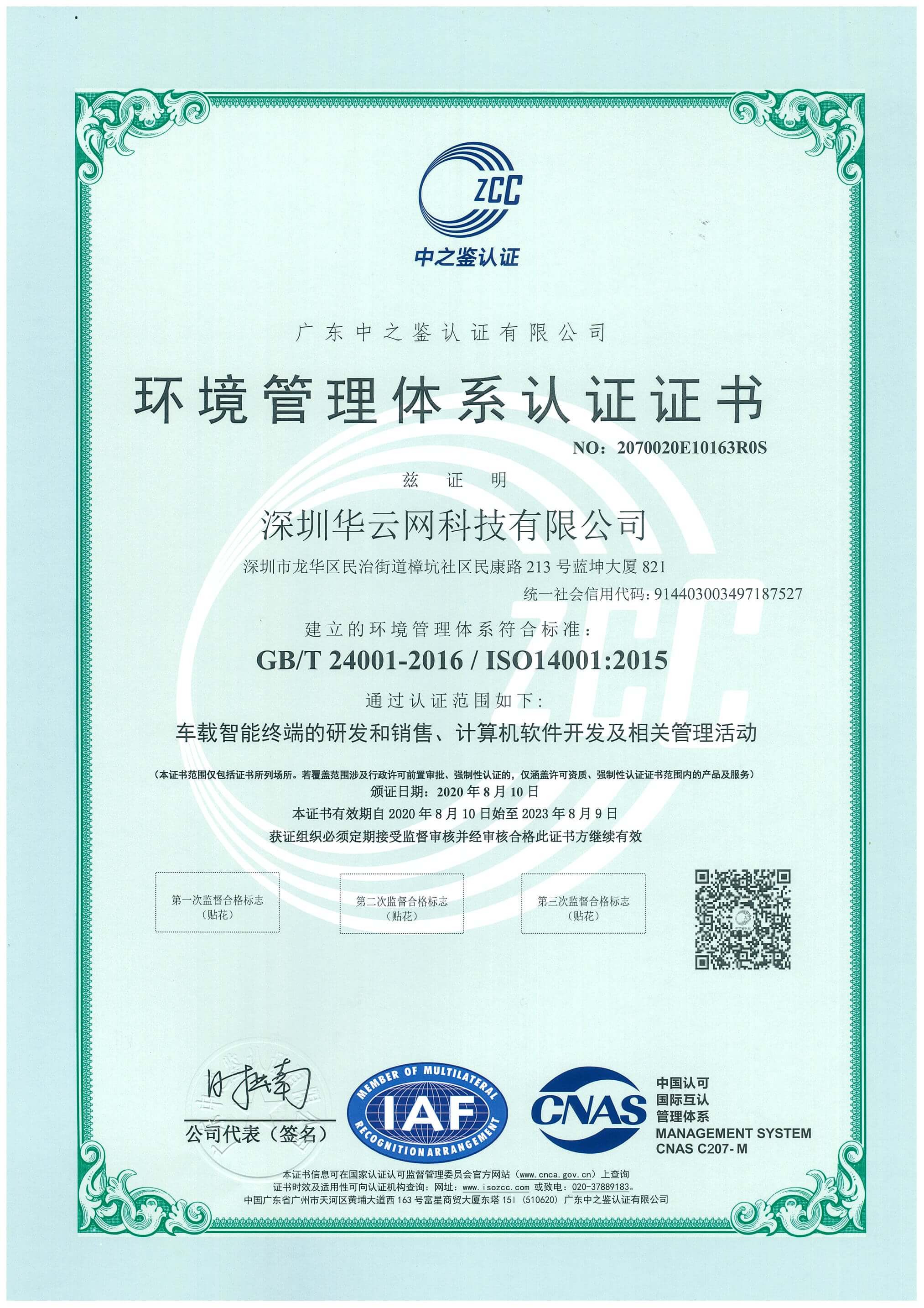 近日,暨ISO9001质量管理体系再认证审核通过之后,深圳华云网科技有限公司也通过了ISO14001环境管理体系的认证审核,顺利取得ISO9001与ISO14001双证书!
